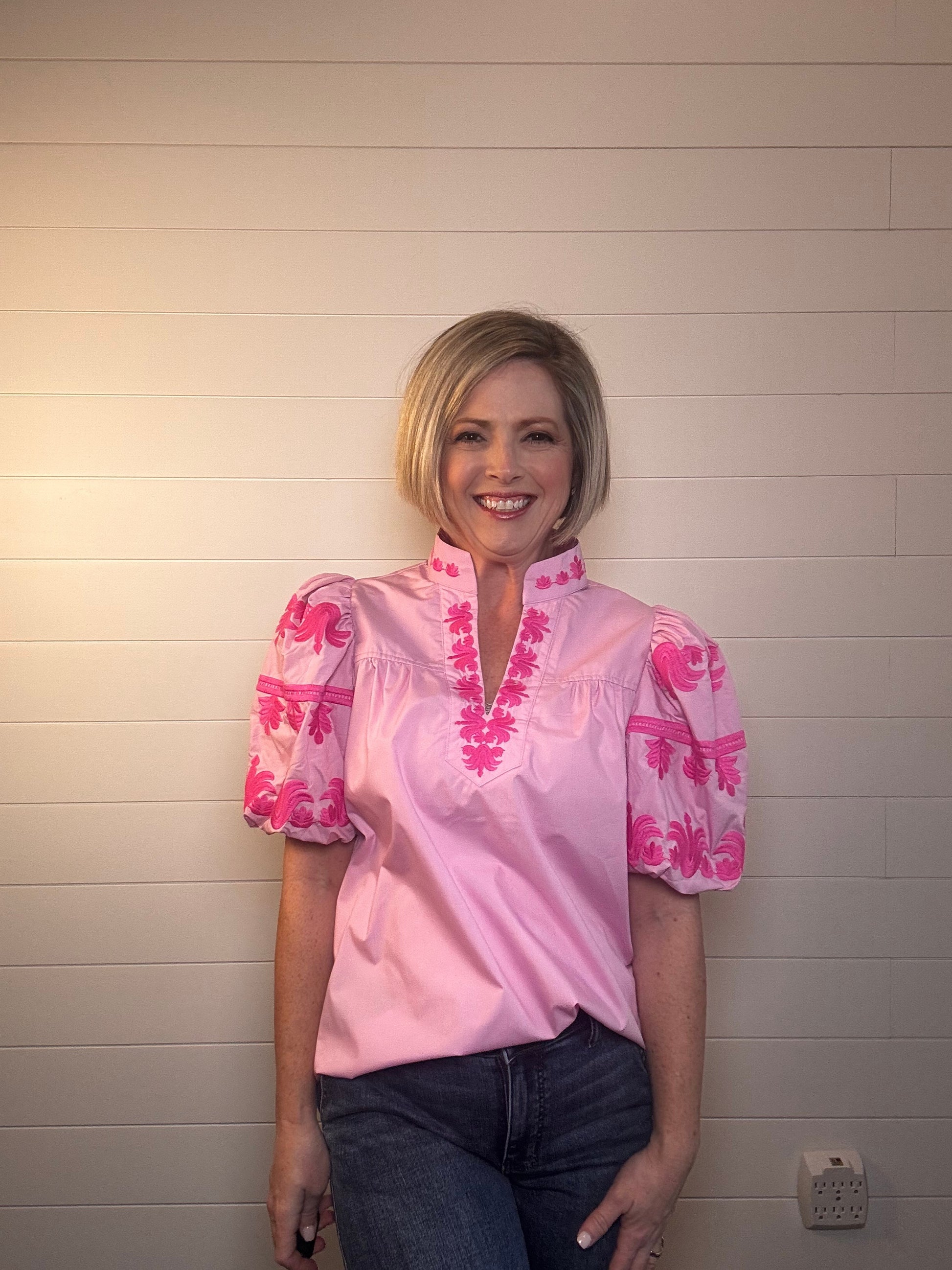 Soft, feminine, and effortlessly elevated, this embroidered blouse is a standout piece for spring and summer. Designed with delicate floral embroidery along the neckline and sleeves, it features a flattering split V-neck and structured puff sleeves that add just the right amount of statement. The lightweight woven fabric offers a polished look while remaining comfortable for all-day wear. Easy to dress up with trousers or keep casual with denim, this top is perfect for brunch, school events, or everyday moments that call for something special.