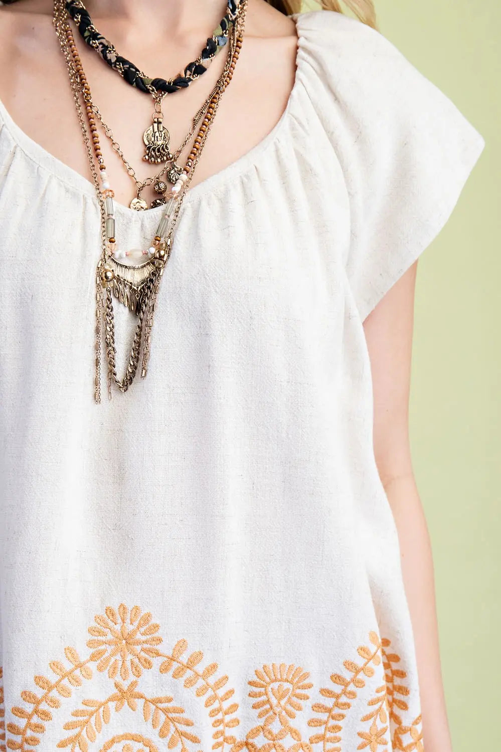 Elevate your casual wardrobe with this pants set, featuring an oatmeal-colored embroidered linen V-neck top with padded cap sleeves for a flattering silhouette. The relaxed-fit pants offer all-day comfort and style, enhanced by a tasseled drawstring that adds a chic, effortless touch. Perfect for fall days or laid-back gatherings, this set combines breathable fabric and thoughtful details to keep you looking fresh and poised.