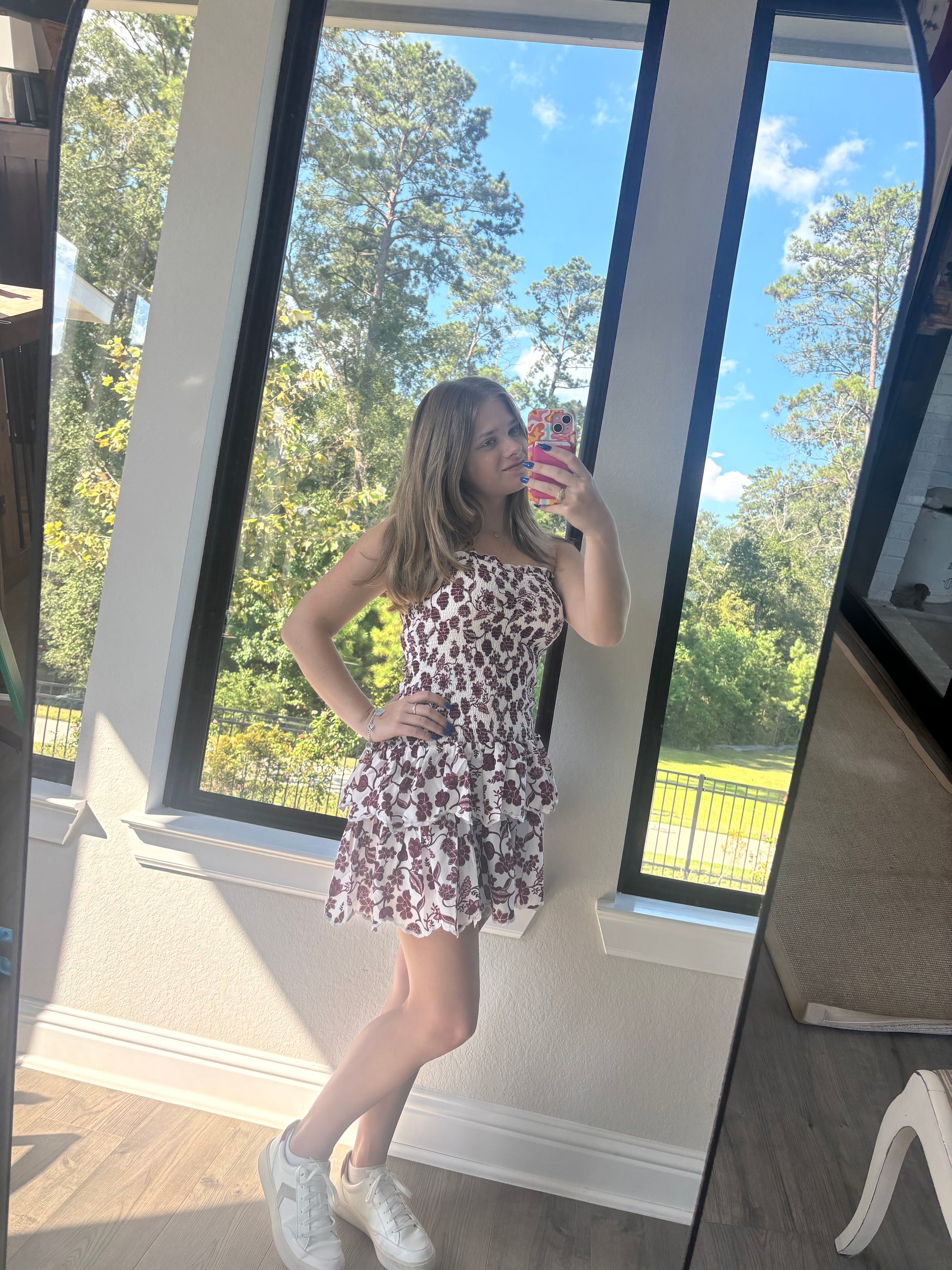 Elevate your wardrobe with the Makenna Maroon Floral dress, featuring a sleeveless silhouette and delicate smocked bodice for a tailored fit. The low hip design and embroidered ruffle hem add subtle elegance, while the rich maroon floral print offers timeless sophistication. Perfect for any occasion where style meets grace.