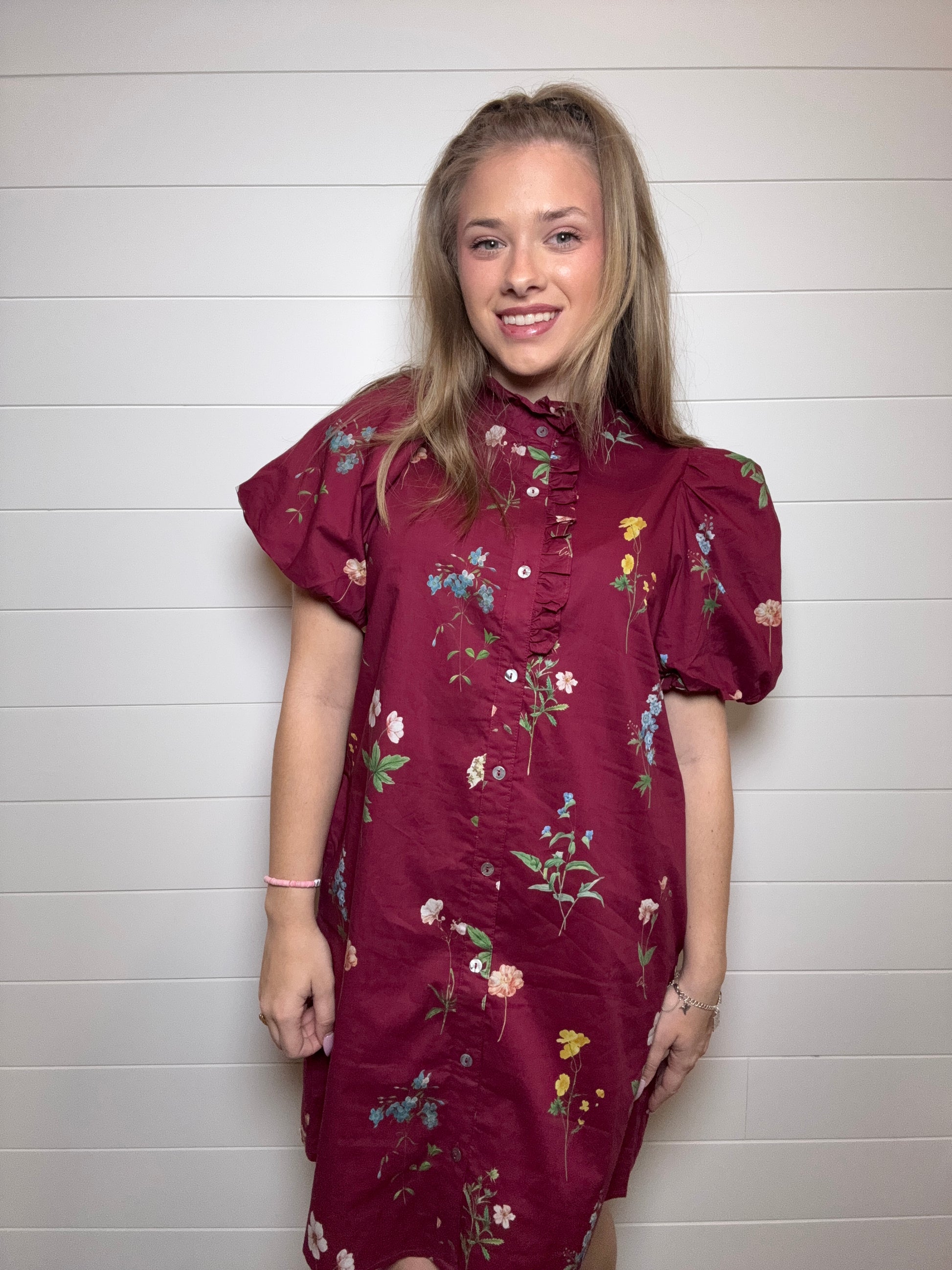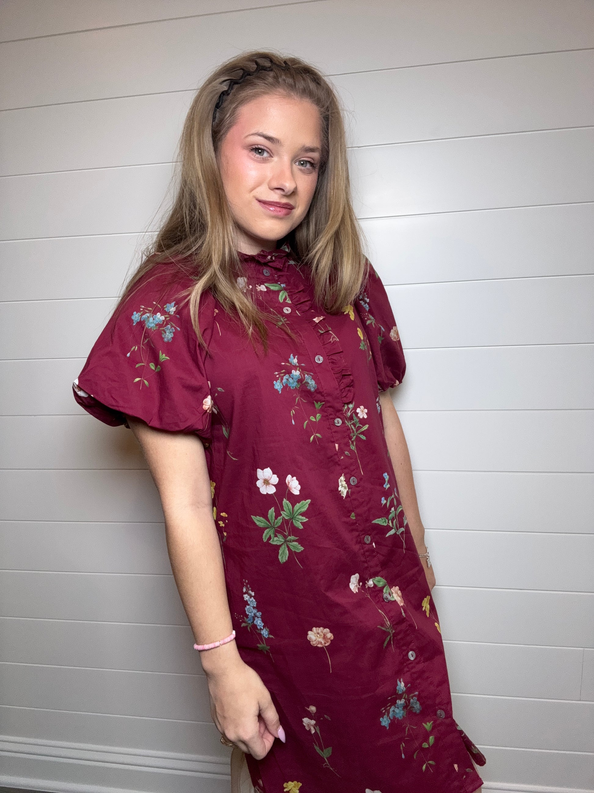 Elevate your wardrobe with this maroon floral mini dress, a refined piece that seamlessly transitions from day to evening. The delicate print pairs beautifully with a distinctive ruffle accent band collar and button-front closure for effortless styling. Practical side pockets and a lined, non-sheer construction ensure comfort and confidence. Crafted from lightweight woven fabric with charming bubble sleeves, this dress offers both sophistication and ease of movement—a versatile essential for the modern woman.