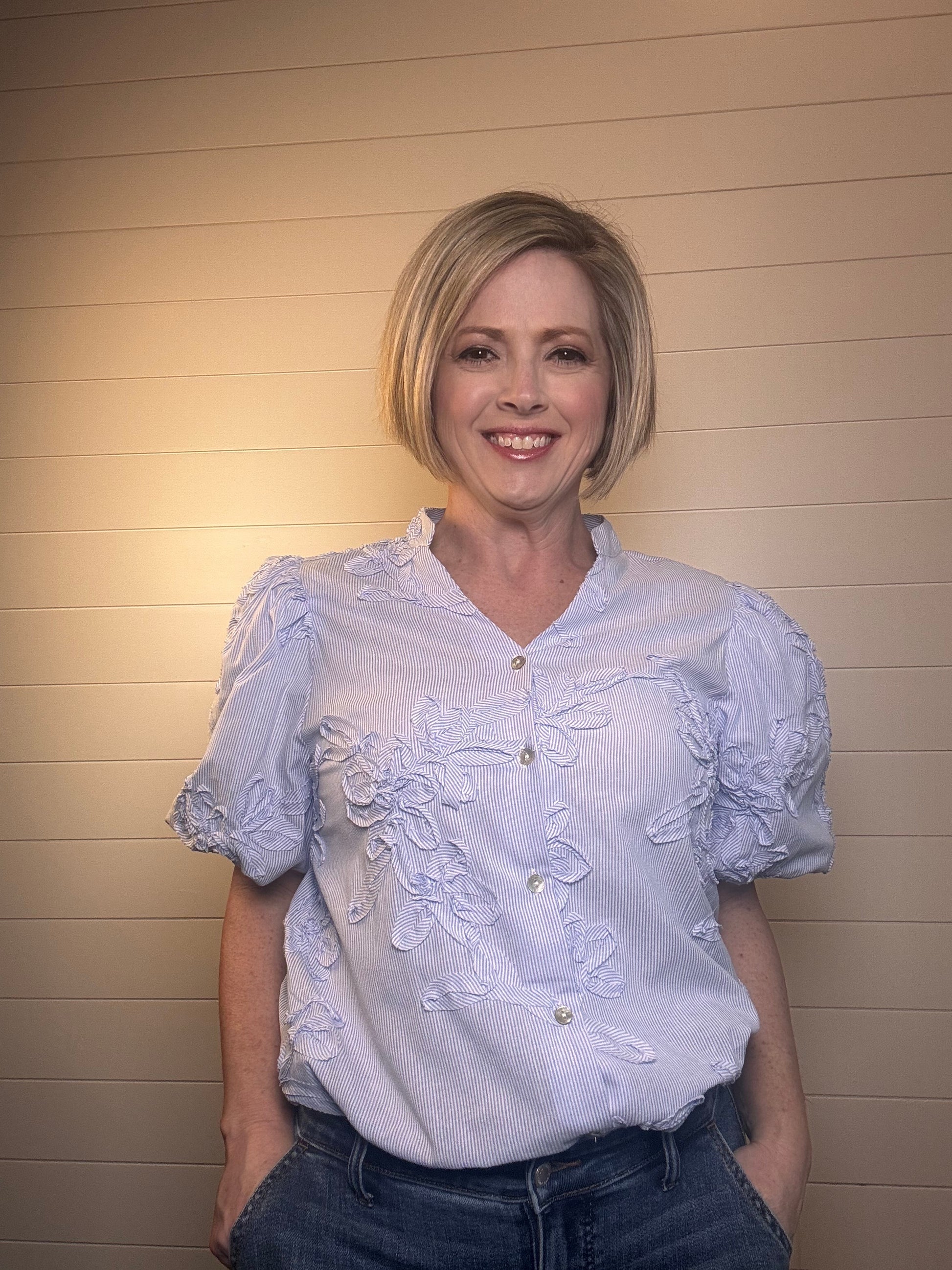 This light blue blouse blends classic charm with elevated texture, featuring delicate floral appliqué detailing throughout for a soft, feminine look. Designed with a relaxed fit, subtle puff sleeves, and a flattering button-front neckline, it’s an easy piece that feels both polished and effortless. The lightweight fabric makes it perfect for warmer days, while the tailored details keep it refined.
