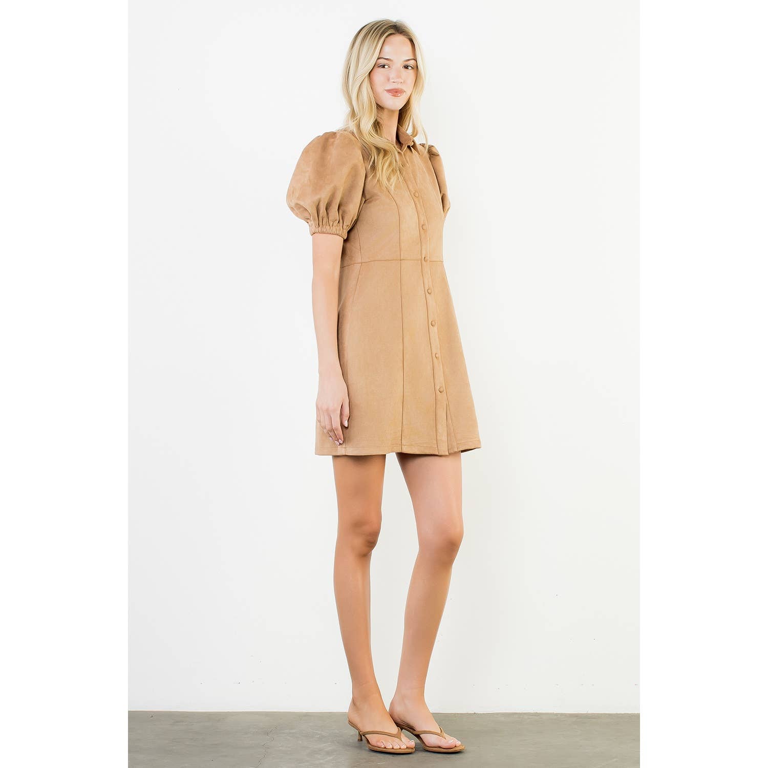 Puff Sleeve Button Up Suede Dress This Puff Sleeve Button Up Suede Dress offers a versatile and stylish addition to your wardrobe. Made with suede material, it provides a soft touch and a luxurious feel. The puff sleeves add a touch of femininity, while the button-up design offers a classic and timeless look. Perfect for any occasion, this dress is a must-have for any fashion-forward wardrobe.
