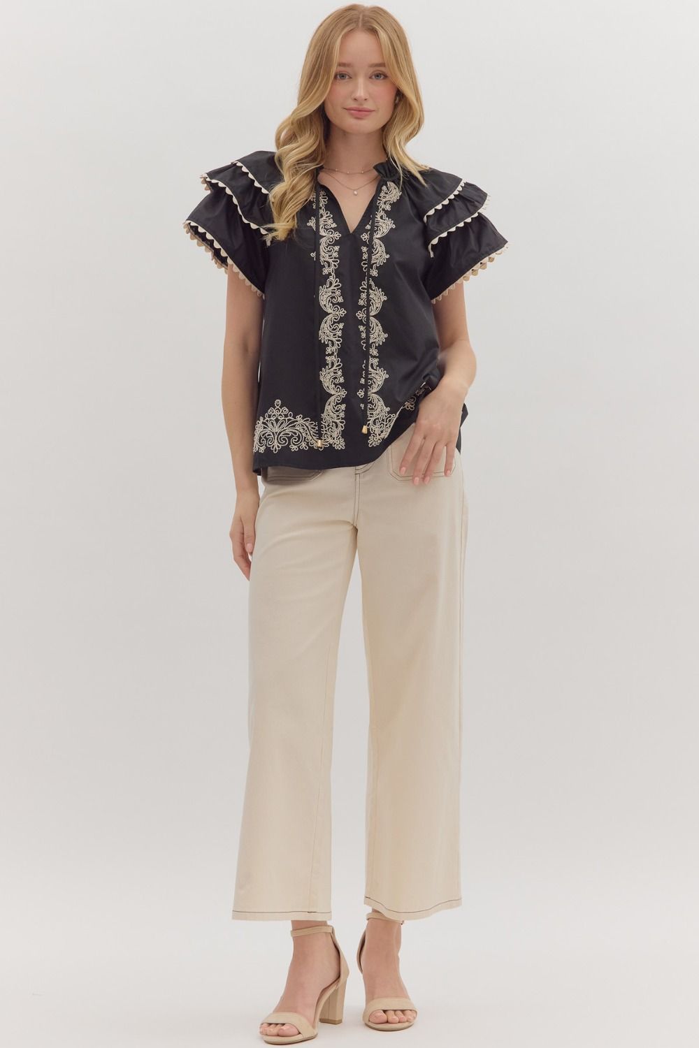 Elevate your wardrobe with the Quinn Black Top, designed to combine elegance and comfort effortlessly. This lightweight, woven top features delicate short flutter sleeves enhanced with scallop-accented layered trim and subtle embroidery for a refined touch. The self-tie V-neck adds versatility and flattering detail, while the unlined, non-sheer fabric keeps it breathable and perfect for any occasion. Whether dressed up or down, this top brings a graceful silhouette and stylish flair to your everyday look.